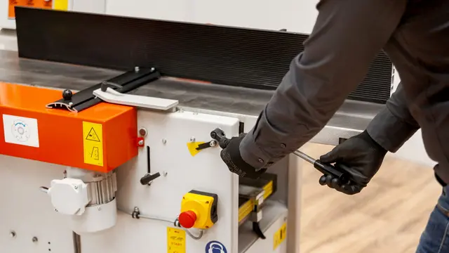 På denne maskinen omdannes dermed råskur til ferdige produkter. Start på det øverste bordet ved å justere to tilstøtende sider pent i rett vinkel.