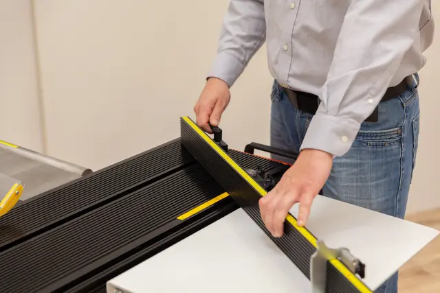 Bladets høyde og vinkel kan justeres presist, og sideanlegget har mikrojustering for maksimal kontroll og nøyaktighet. Den skråstilte gjerdet på sleden kan plasseres på begge sider, avhengig av om du trenger å føre materialet med eller mot gjerdet under kuttingen. Med en bordhøyde på 850 mm får du en komfortabel arbeidshøyde som er optimal for lange arbeidssykluser.